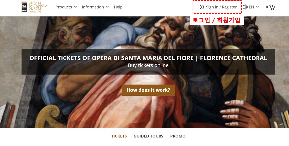 3. 피렌체 두오모 통합권은 회원가입 후 예매가 가능해요 우측상단 Register를 선택해주세요