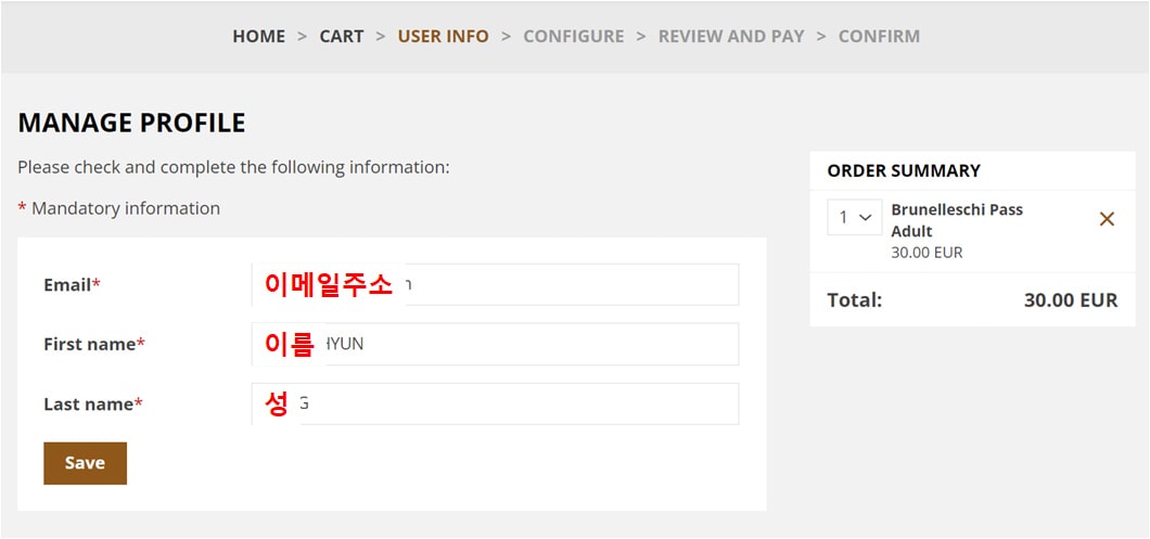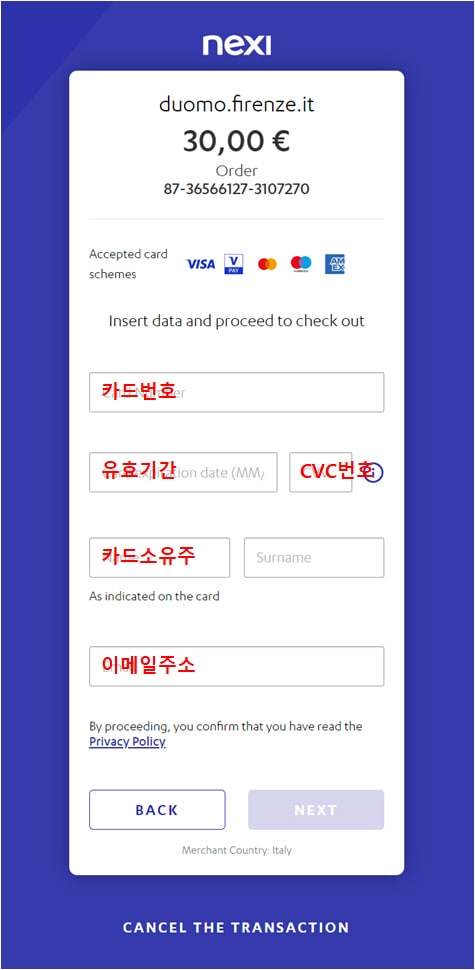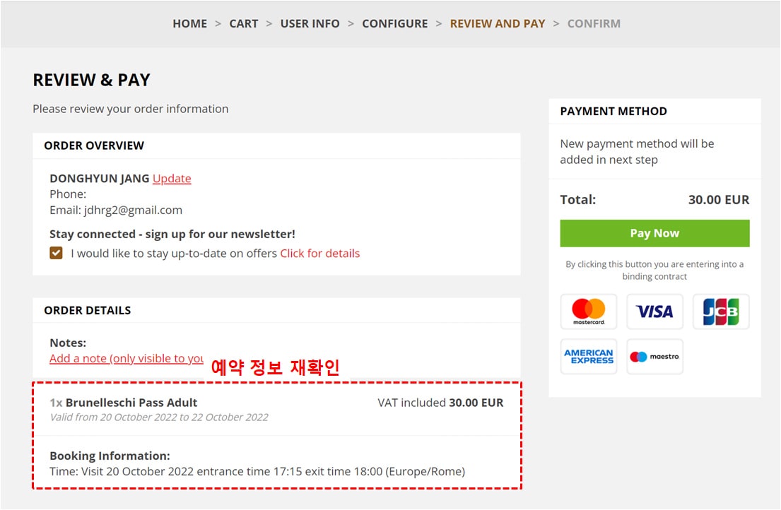 13. 마지막으로는 개인정보를 확인하고 내가 예약한 일정도 맞는지 확인을 해준 후 이탈리아 여행 준비물인 피렌체 두오모 통합권의 결제가 진행돼요.