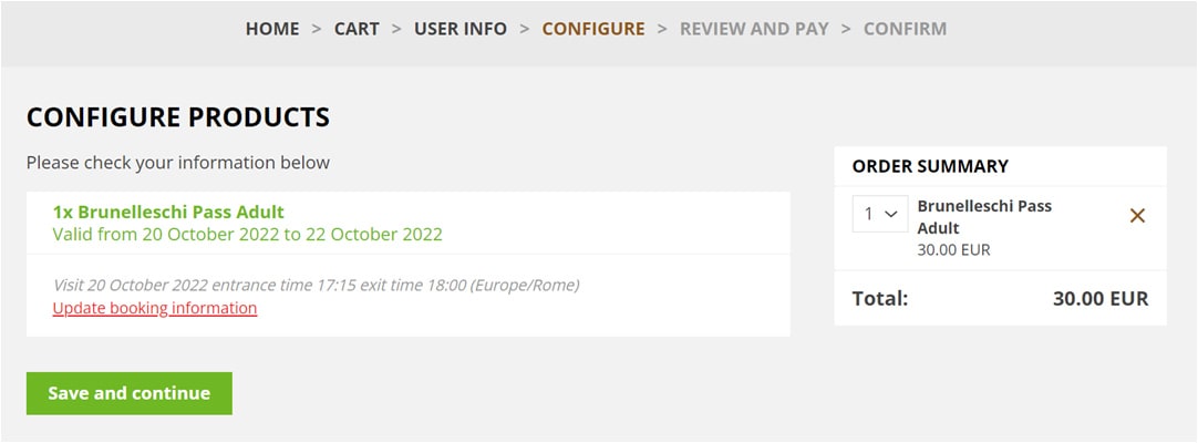 5. 이제 Brunelleschi Pass를 선택해주세요. 3가지 티켓종류가 있지만 피렌체 두오모 대성당 통합권이 포함된 것은 Brunelleschi Pass에요.