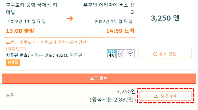4. 후쿠오카 공항에서 유후인 버스 예약을 얼마 남지 않은 일자로 검색하면 이렇게 만석인 경우가 많으니 여행 일정이 정해지면 미리 예약을 하는 것을 추천해요.