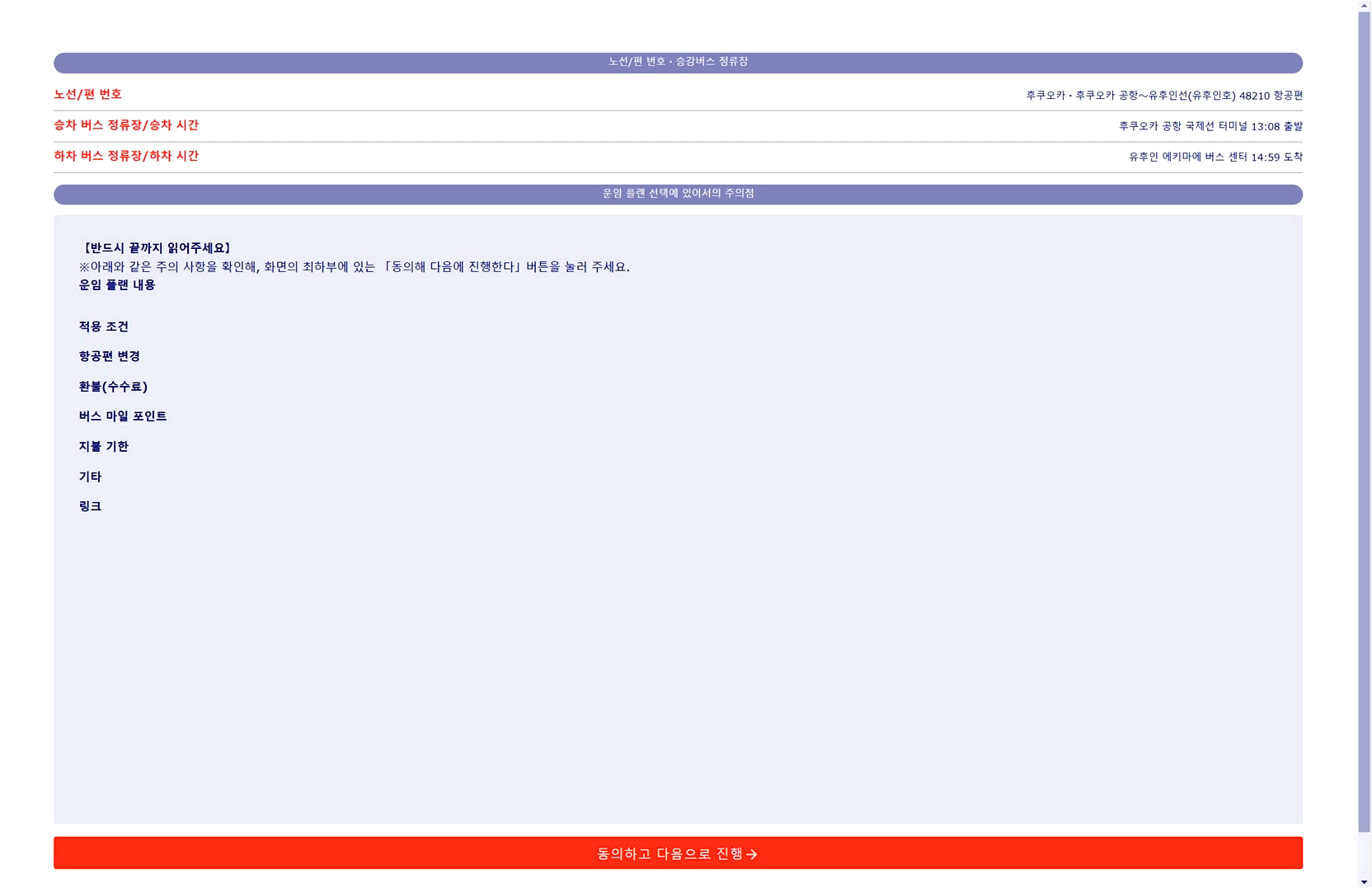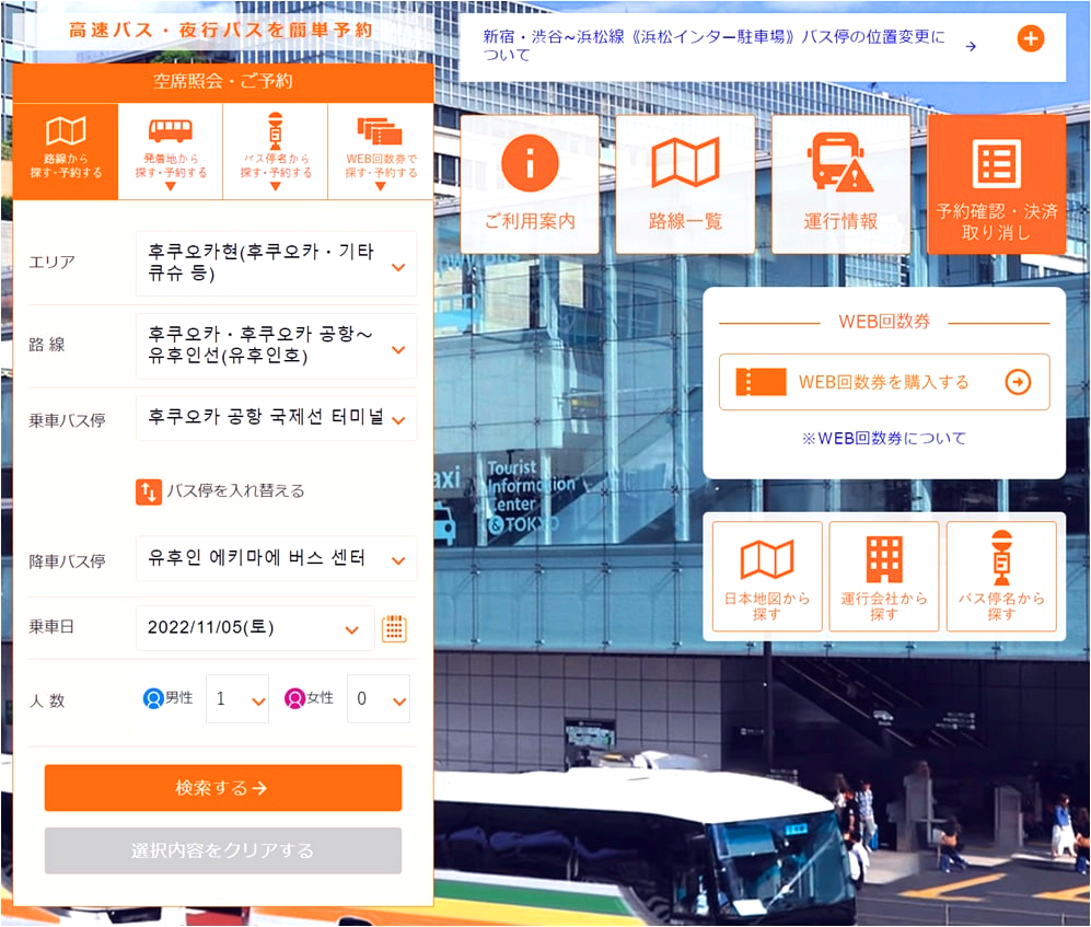 2. 후쿠오카 공항에서 유후인으로 가는 버스 예약이 진행되는 일본고속버스 사이트 한국어페이지에서는 예약이 진행되지 않아 일본어 버전에서 예약을 해야해요. 크롬, 웨일 등 자동번역 기능이 있는 PC에서 진행을 추천드려요.
