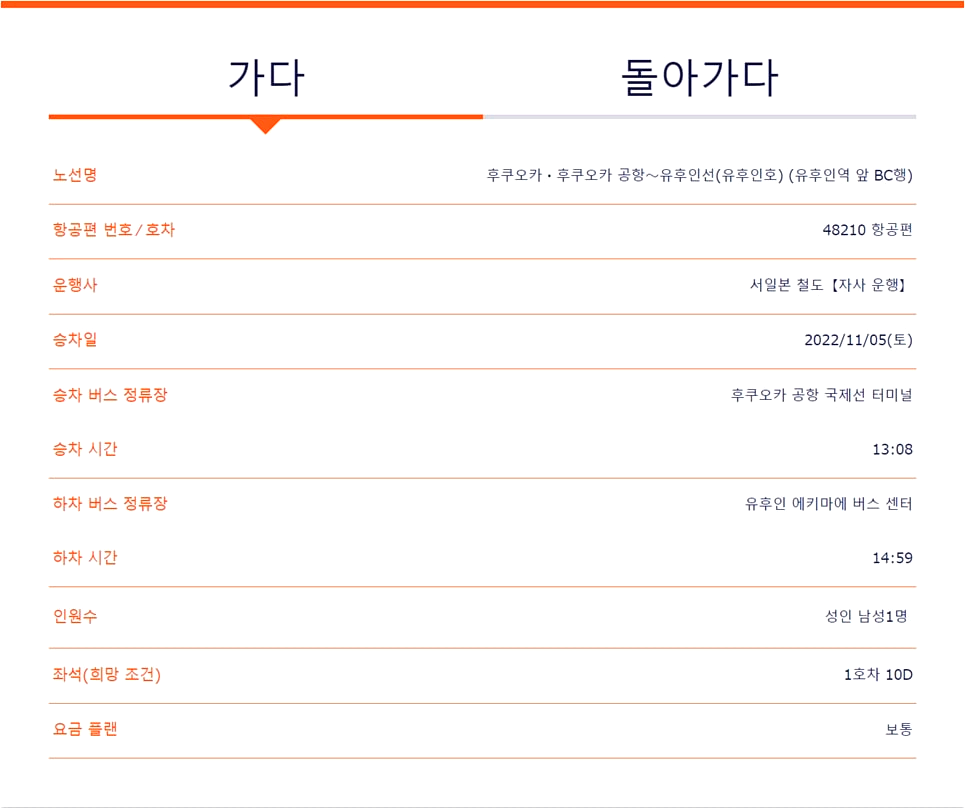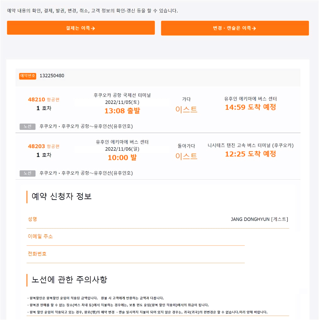 10. 왕복 버스의 시간을 모두 정했다면 개인정보를 입력하여 후쿠오카에서 유후인 버스예약이 완료돼요. 시간 예약만 진행이 되고 결제는 따로 해야하기 때문에 이메일은 반드시 해외메일을 받을 수 있는 메일로 적어주세요.