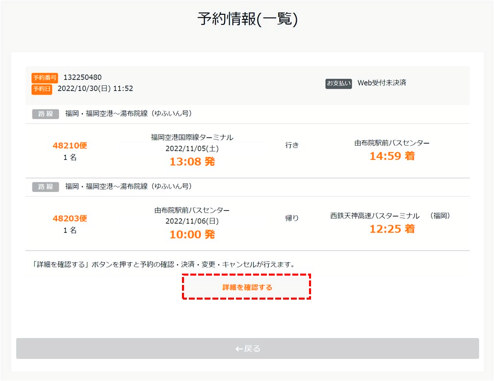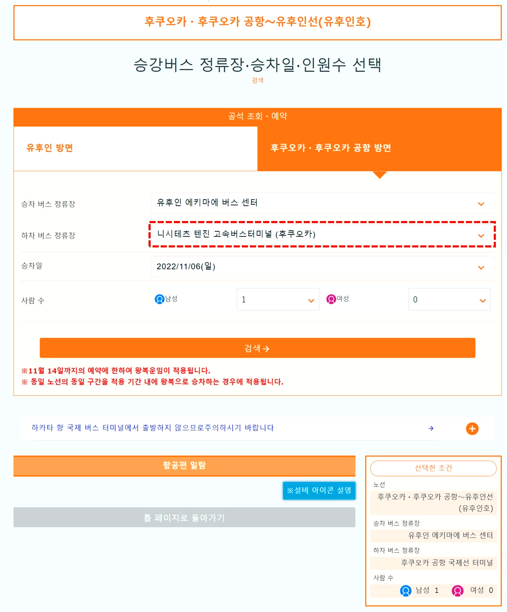 9. 유후인에서 후쿠오카로 돌아오는 버스 예약의 경우 예약방법은 동일하지만 하차 버스 정류장을 잘 선택해주세요.
