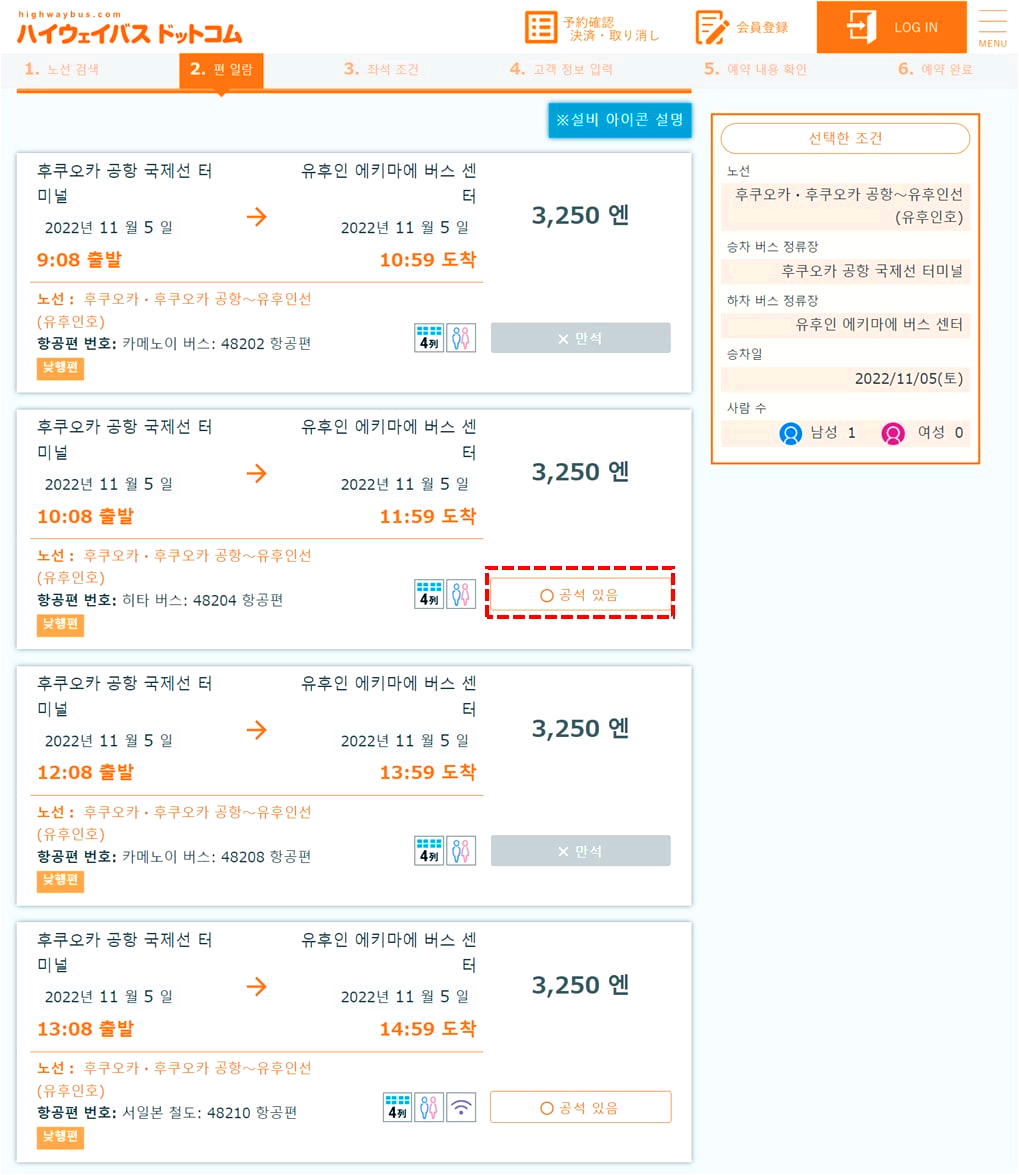 5. 내가 후쿠오카에 도착하는 시간 +1시간 30분~2시간정도 후의 버스좌석이 남아있다면 공석 부분을 선택해 남은 좌석수를 선택해주세요. 예전에는 후쿠오카 도착 이후 +30분정도의 버스를 예약했지만 근래에는 입국 심사가 1시간정도 소요된다고 해요.