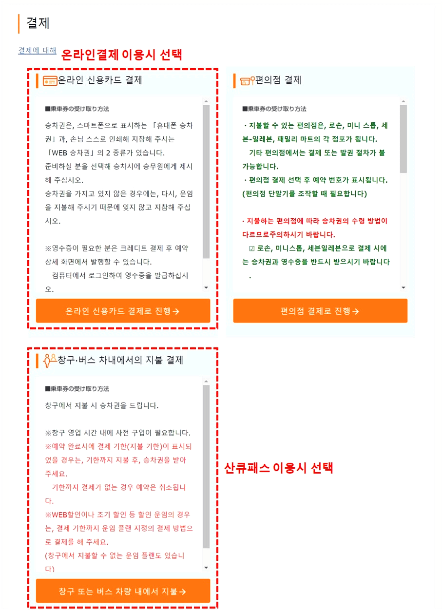 19. 온라인 결제로 구매하실 경우 온라인 신용카드 결제를 선택해 진행해주시면 되고, 산큐패스를 이용할경우 창구, 버스에서의 지불을 선택해 버스 창구 영업시간내에 방문해 산큐패스를 제시하면 버스 탑승권을 받을 수 있어요.