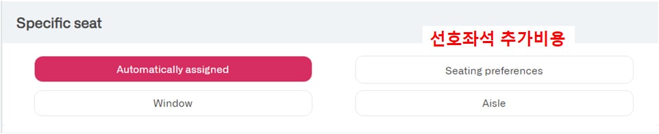 8. 좌석선택의 경우 둘이서 갔다면 기본으로 선택해도 크게 불편하지 않아요. 혼자 방문했다면 본인이 선호하는 스타일에 맞춰 Window(창가), Aisle(복도) 정도만 선택해주세요. Seating Preferences를 선택할 경우 좌석 예약비가 발생하는데 다른 교통편에 비해 금액이 높아요.