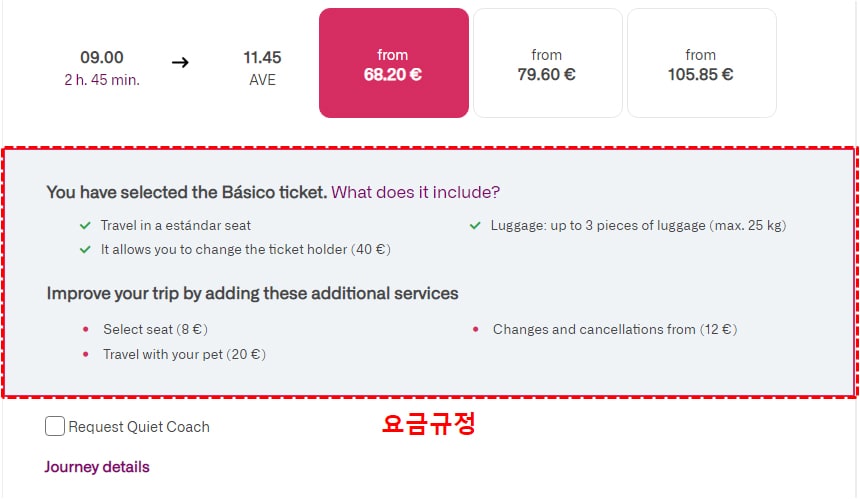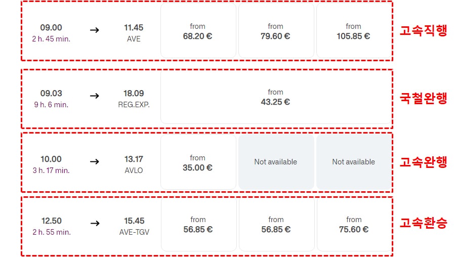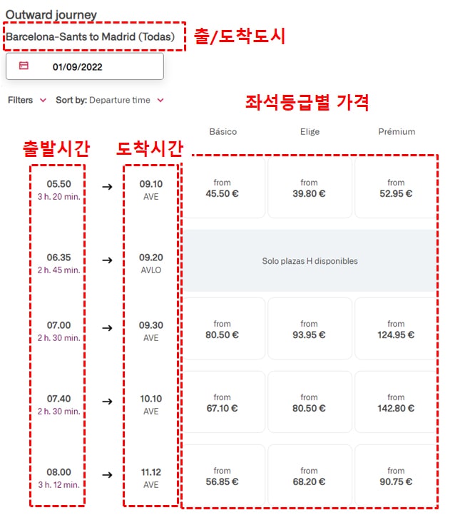 5. 여정을 검색 후 나오는 결과페이지에요. 스페인 렌페를 예약 할 때에는 좌석등급별 가격, 출/도착시간 부분을 자세히 봐주셔야해요.