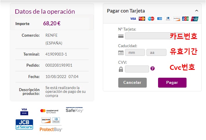 10. 이제 카드 번호와 유효기간, cvc번호까지 입력하면 결제 끝! 티켓은 개인정보 입력 시 작성한 이메일로 발송되는데 유럽 교통권은 발송이 늦거나 누락되는 경우가 있어 결제 이후 페이지는 바로 종료하지 마시고 예약번호는 스크린샷을 찍어두는 것을 추천해요.
