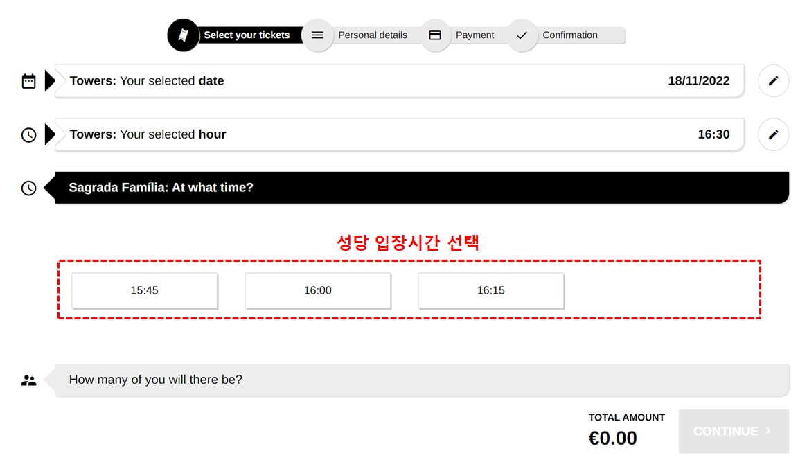 7. 성가족성당 종탑 타워 종류와 입장 시간을 골라야해요. 종탑은 Tower on the Passion facade(고난의 파사드) 와 Tower on the Nativity facade(탄생의 파시드) 두가지 옵션이고, 시간의 경우 동계에는 16:30~16:45 시간대가 일몰을 볼 수 있어서 선호하는 시간이지만 하계에는 일정에 맞춰서 선택해주세요.